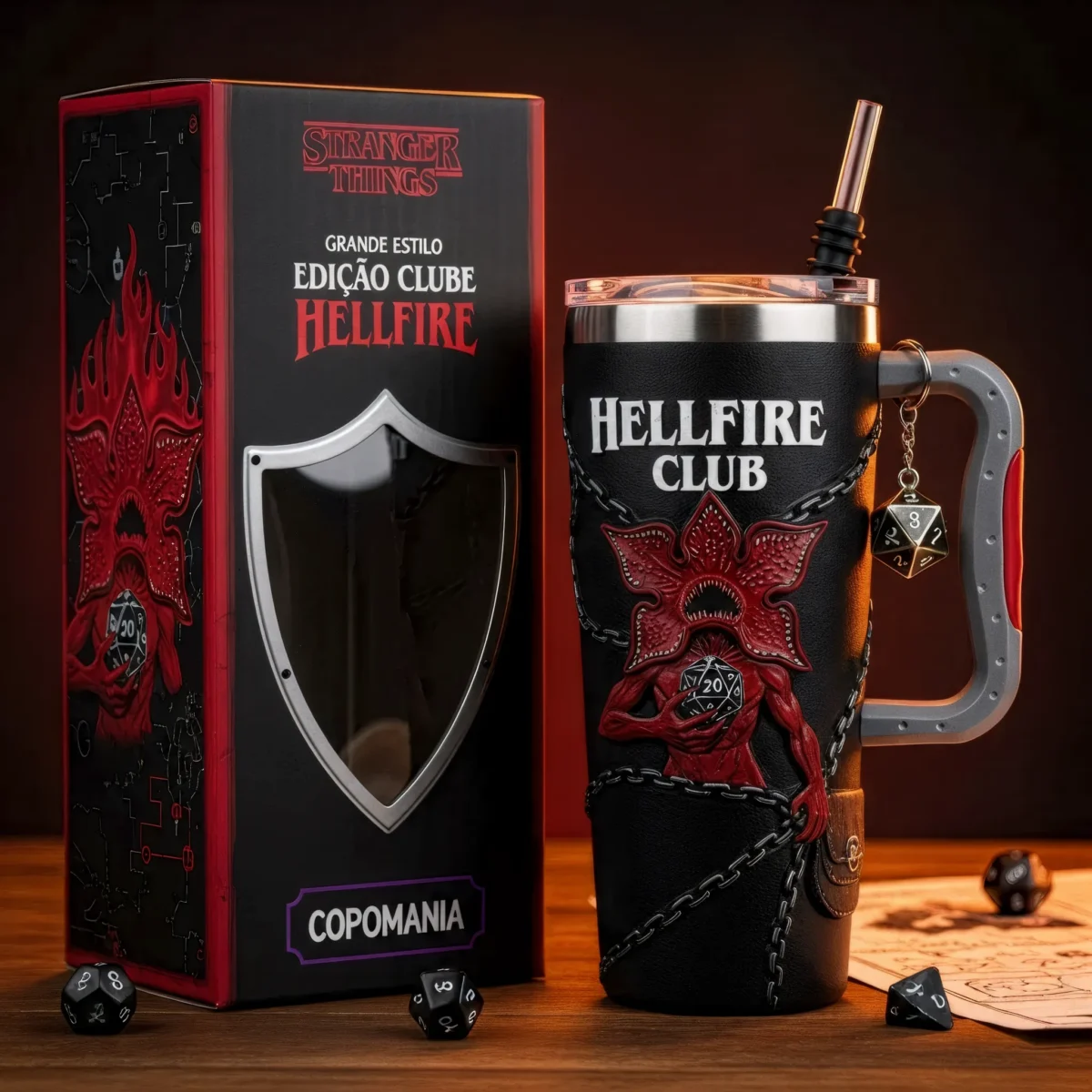 🔥 Role iniciativa contra a sede! O Copo Térmico Hellfire Club chega em preto texturizado e apresenta Demogorgon em relevo 3D, correntes e escudo metálico. O pingente de dado D20 garante sorte (ou caos) nas suas campanhas.