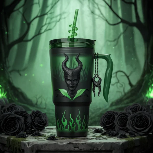 Sombrio, elegante e poderoso. O design preto com espinhos roxos em relevo destaca o rosto imponente de Malévola, enquanto o canudo espiral e o pingente com seus chifres garantem presença em qualquer ambiente.
