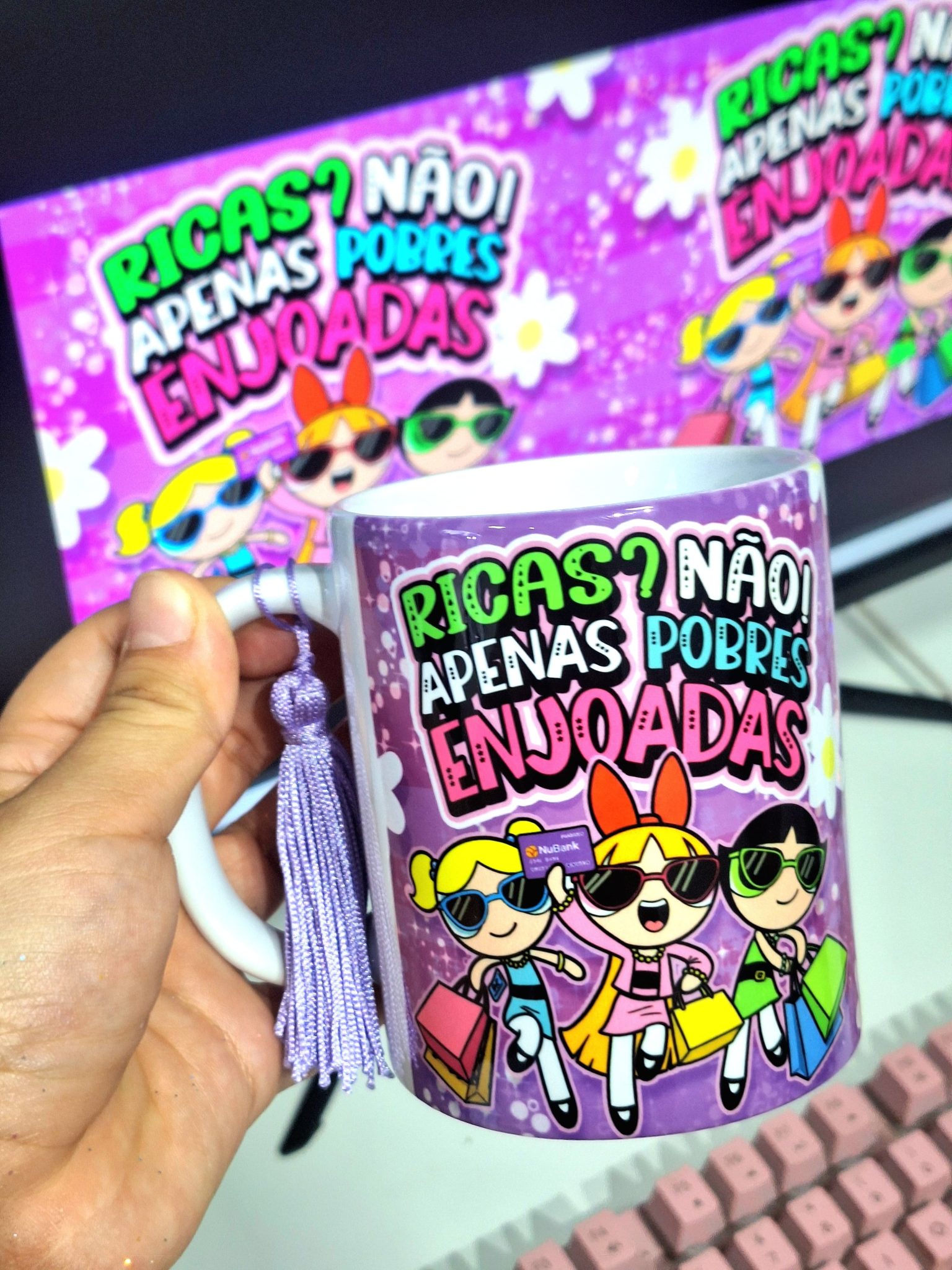 🟣 Caneca Meninas Superpoderosas – “Ricas? Não. Apenas Pobres Enjoadas” + Pingente Lilás 350ml