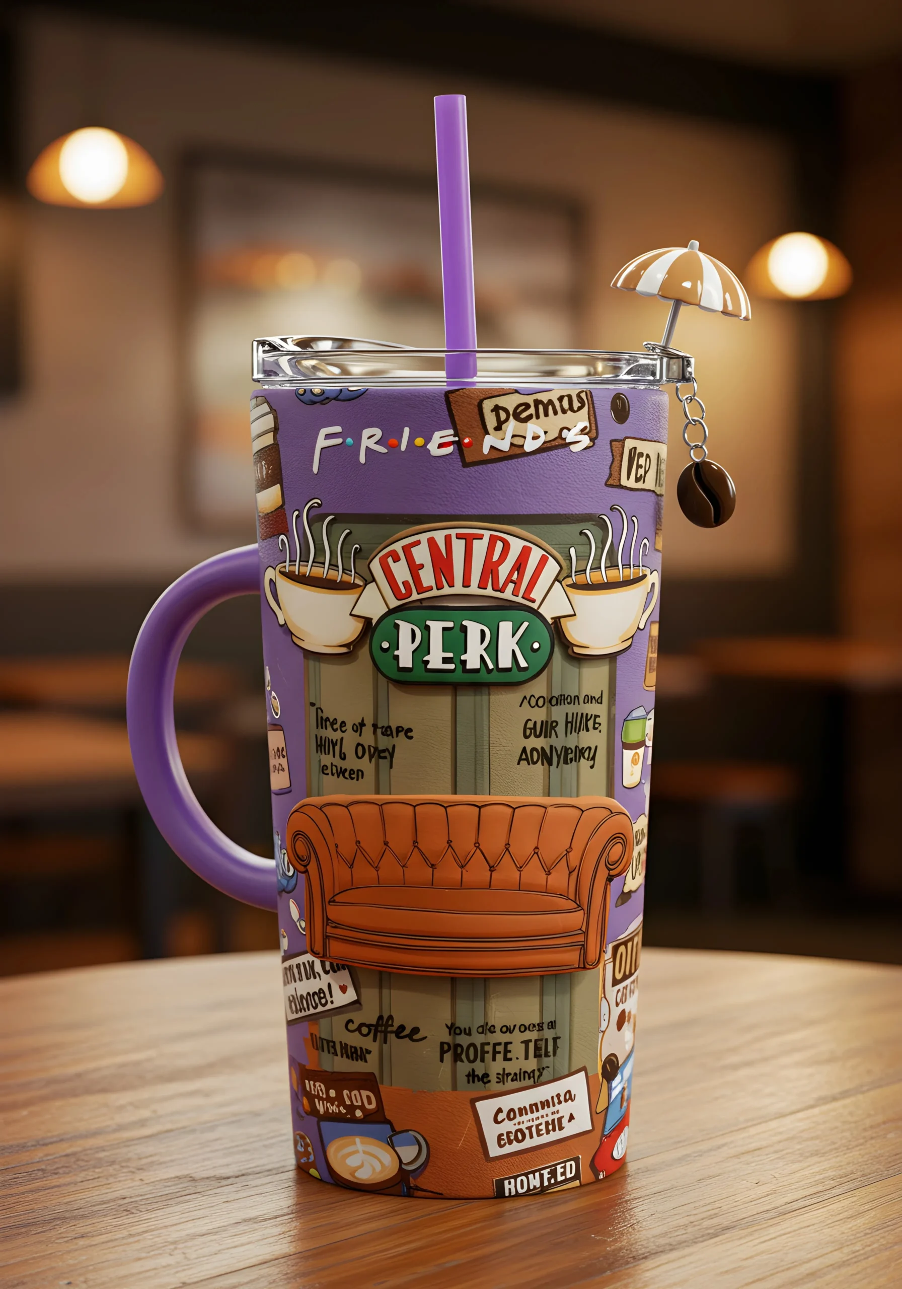 🥤 Com 1,15L de capacidade e excelente isolamento térmico, é ideal para manter seu café, chá ou água na temperatura ideal. A alça roxa e o canudo tornam o uso prático e estiloso, digno de uma tarde no Central Perk. ☕